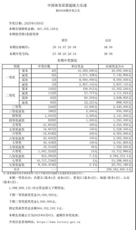 4月9日,超级大乐透第25038期开奖,同时本期也是大乐透8.8亿大派奖活动的首期开奖。本期前区开出号码07、08、20、26、34;后区开出号码08、09。本期全国销售3.67亿元,奖池滚存:10.98亿元。