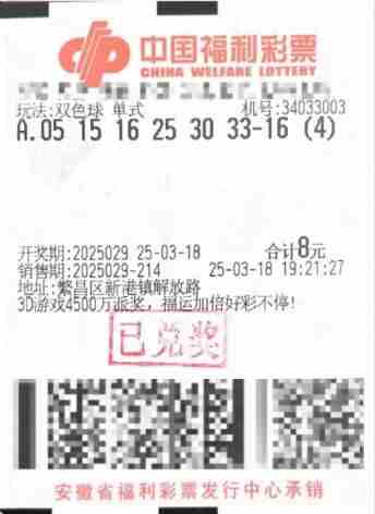 在3月18日晚的双色球第25029期开奖中,红球号码为05、15、16、25、30、33,蓝球号码为16。当期全国共开出11注一等奖,每注奖金为7159104元。安徽省获得了其中的4注,黑龙江3注,北京、河北、湖北、新疆各中得1注。根据系统查询,安徽的4注一等奖全部来自芜湖市的一家投注站,总奖金为2863万余元。