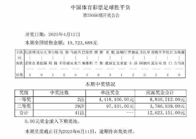 北京时间4月12日,胜负彩第25056期开奖结果揭晓。本期头奖开出2注,单注奖金4,418,106元,二等奖开出39注,单注奖金97,101元,任九开出296注42,110元。本期足彩销量为19,723,688元,任九投注总额为19,475,974元。