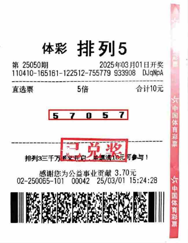 3月1日,体彩排列5第25050期如期开奖,当期开出的中奖号码为57057。在开封市,一位幸运的购彩者凭借一张5倍直选票,仅以10元的投注金额,便一举斩获了高达50万元的大奖。