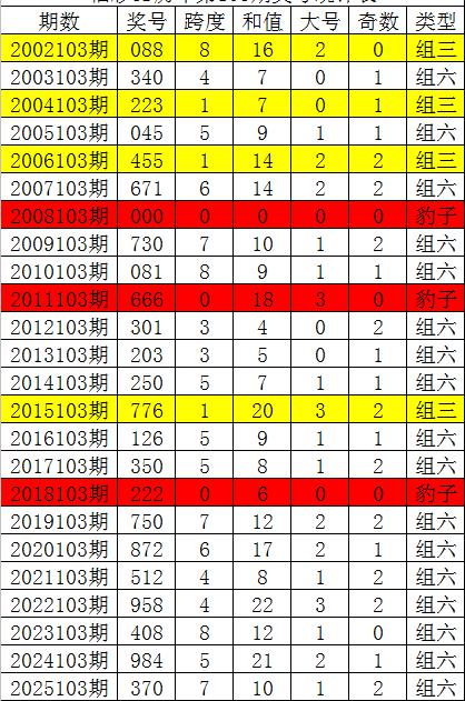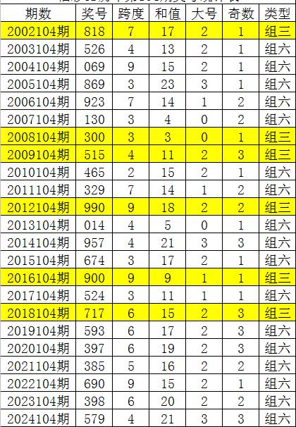 从以上统计可以看出,历年3D第104期开出了6次组三号码,开出了17次组六号码。组六号码出现概率大,本期预计开出组六号码。