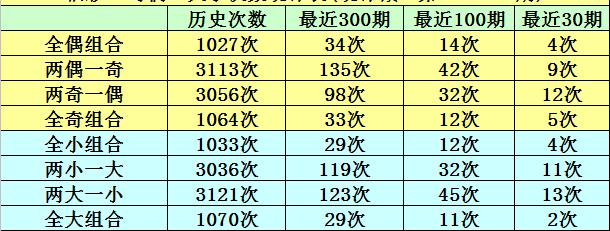在前10期开奖中,全大组合出现0次,全小组合出现0次,两小一大组合出现5次,两大一小组合出现5次,本期预计开出两小一大组合。