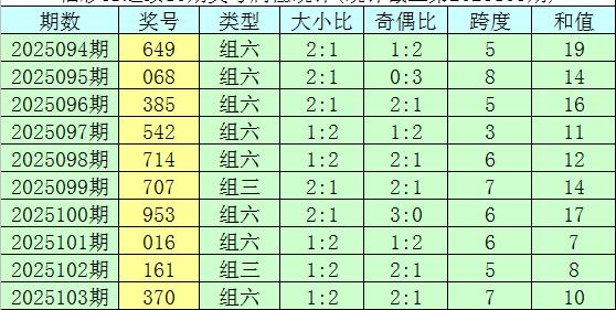 开奖回顾:福彩3D第2025103期奖号为370。奖号形态为组六,大小形态为小大小,奇偶形态为奇奇偶,和值为10,跨度为7。