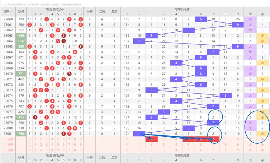 通过观察跨度及跨度属性走势可以发现:近10期内跨度大数小数号码出号数量较均衡,本期跨度大数号码和小数号码均有可能出号,本期跨度应该综合考虑;再结合上述走势图看,本期跨度看好567,防邻号2等号码。