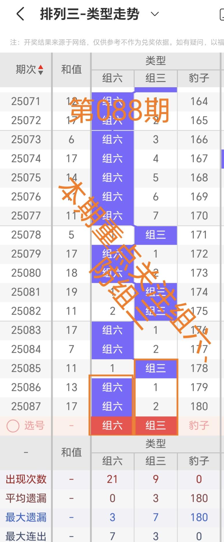 从近三十期的走势来看,形态组六出现了21次,平均遗漏次数为0;形态组三出现了9次,平均遗漏次数是3次;形态豹子出现了0次,平均遗漏次数为180次,上期开出的形态是组六。本期重点关注组六形态,其次防备组三形态