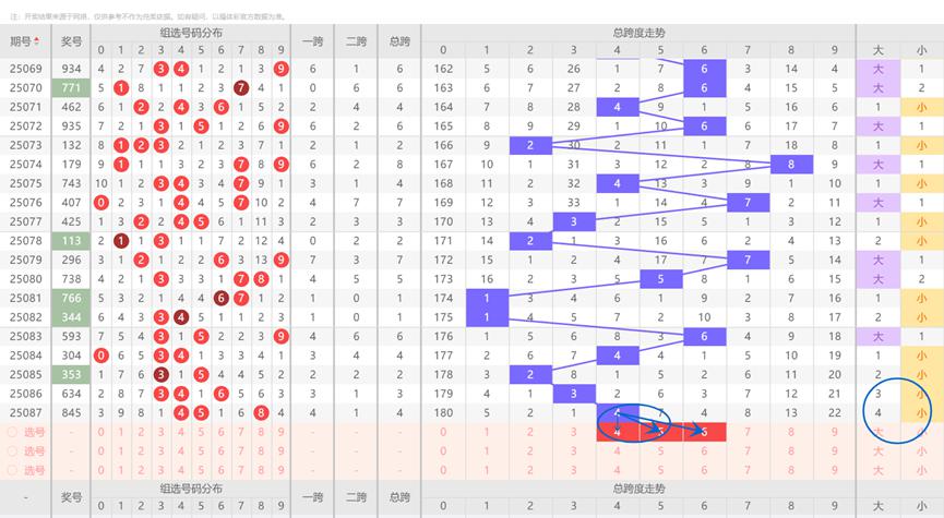 通过观察跨度及跨度属性走势可以发现:近10期内跨度小数号码出号后,下期容易连开小数号码,上期跨度开出了小数号码4,本期跨度小数号码可能会继续出号,因此本期跨度选号时仍然需要重点关注小数号码出号,防大数号码;再结合上述走势图看,本期跨度看好456等号码。