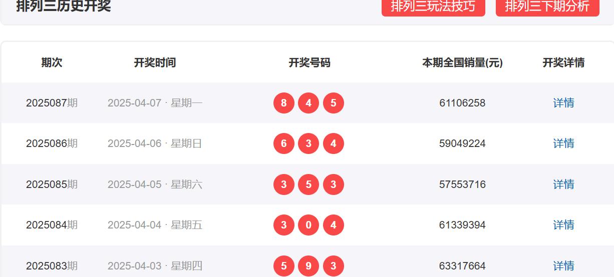 体彩排列3上一期,开奖号码845,形态为组六 ,奇偶比为1:2,012路数值表现为212,和值17,和尾7,跨度4。