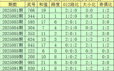 开奖回顾:排列三第2025091期奖号开出:830,组选类型:组六,大小比为1:2,奇偶比为1:2,和值为11,跨度为8。