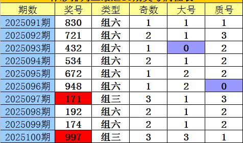开奖回顾:排列三上期开奖号码为:997,大小比为3:0,奇偶比为3:0,质合比为1:2。