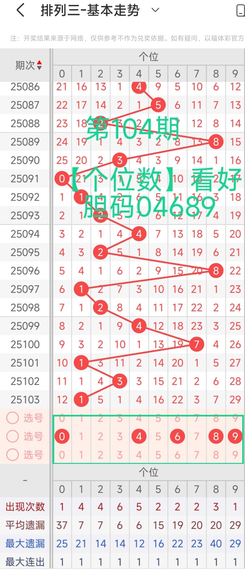 >四、总结分析与推荐 综合以上各个方面的详细分析,并结合我个人的判断,为大家带来排列三第25104期的精心推荐,希望能助力大家选号: