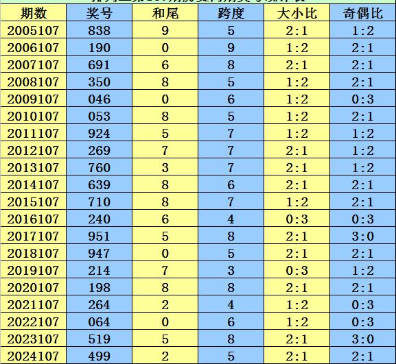 从2004年至今排列三已开出7230期奖号了,本期为排列三2025年第107期开奖,历史同期已出现20次奖号: