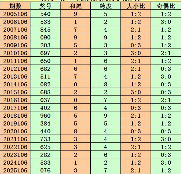 历年第106期排列三同期奖号开出:540、533、845、090、203、697、650、682、511、082、688、037、402、960、384、440、733、625、282、533、076。