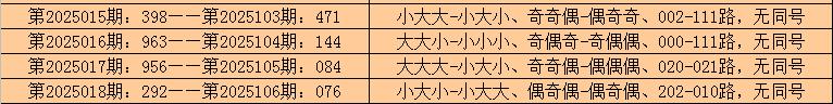所以,排列三第2025019期奖号:734,与排列三第2025107期奖号可能没有同号。且排列三第2025107期奖号大小比、奇偶比和012路比不会与第2025019期奖号直选形态:大小小、奇奇偶和101路全部相同。