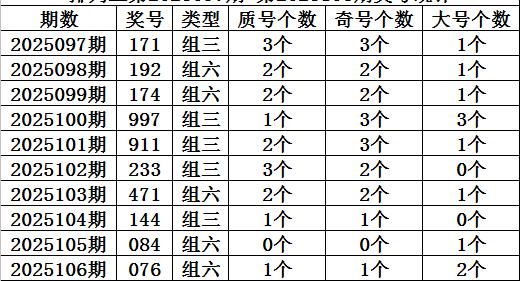 上期回顾:排列三第2025106期开奖:076,质合比为1:2,奇偶比为2:1,大小比为1:2。