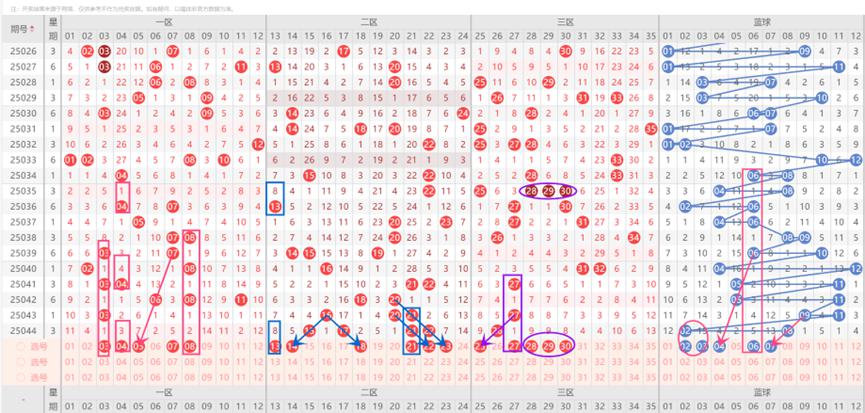 上一期三区开出了1个号码,本期三区有断区的可能性,本期选号时须考虑断三区的情形,本期三区出号数量看好0-1个;本期三区需要关注的号码:25与26-27形成了斜连走势;27为隔期码;28-29-30遗漏值较高,近期可能有号码开出;因此区本期选号范围为25-27-28-29-30等号码。