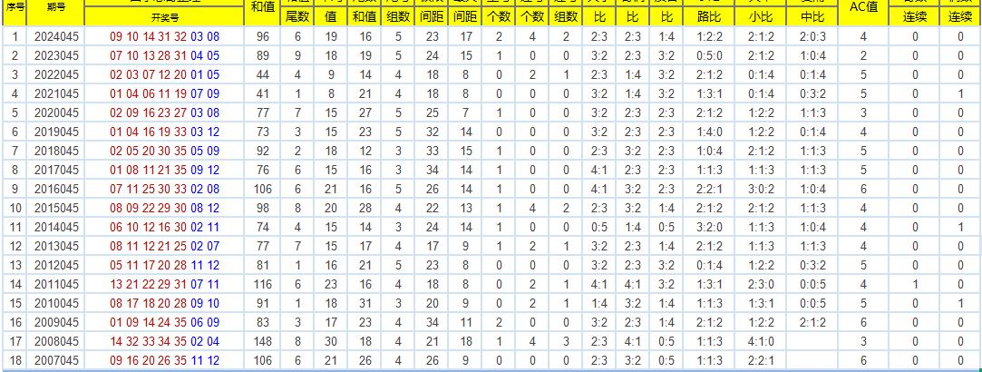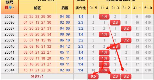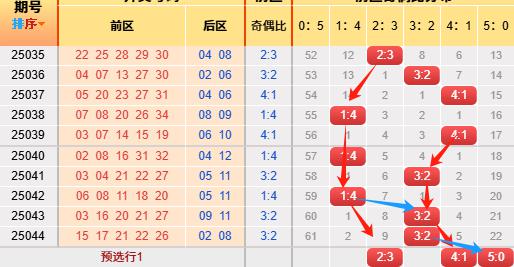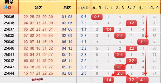 上期前区小大比2:3,命中啦,觉得有用的就点击上个车查看数据。言归正传我们继续用历史数据说话,前区小大比分成6种0:5、1:4、2:3、3:2、4:1、5:0(如图),我统计了一下历史出现次数,0:5出现105次、1:4出现501次、2:3出现944次、3:2出现773次、4:1出现336次,5:0出现51次,再看近10期小大比出现次数比为1:1:4:3:1:0,通过历史数据对比观察以及根据遗漏对称理论原则,故本期我们选择1:4、3:2、4:1。(具体精准方向请查看小车小大比精选)