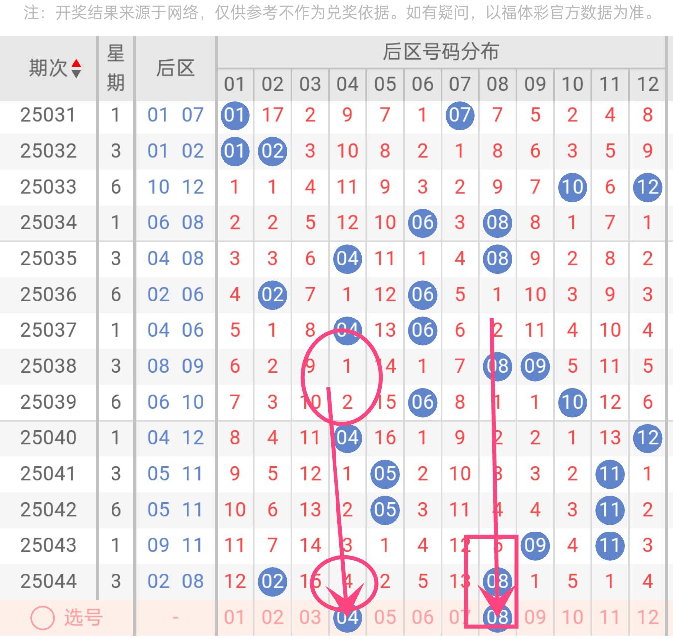 - 蓝球号:奇偶比 1奇1偶(08偶,04偶),大小比 1大1小(08为大,04为小)。