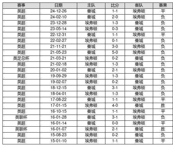 埃弗顿 VS 曼城两队近10年的交战次数为23场,埃弗顿2胜6平15负,赢球概率为8.7%,平局概率为26.1%,输球概率为65.2%。