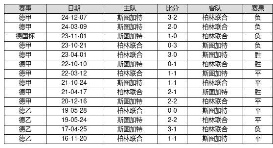 柏林联合 VS 斯图加特两队近10年的交战次数为14场,柏林联合3胜6平5负,赢球概率为21.4%,平局概率为42.9%,输球概率为35.7%。