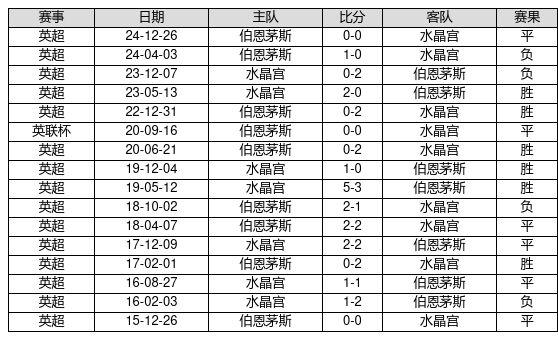 水晶宫 VS 伯恩茅斯两队近10年的交战次数为16场,水晶宫6胜6平4负,赢球概率为37.5%,平局概率为37.5%,输球概率为25.0%。