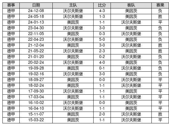 美因茨 VS 沃尔夫斯堡两队近10年的交战次数为20场,美因茨4胜8平8负,赢球概率为20.0%,平局概率为40.0%,输球概率为40.0%。