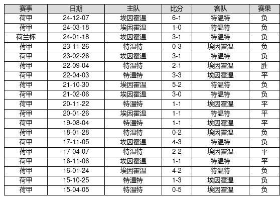 特温特 VS 埃因霍温两队近10年的交战次数为19场,特温特1胜6平12负,赢球概率为5.3%,平局概率为31.6%,输球概率为63.2%。