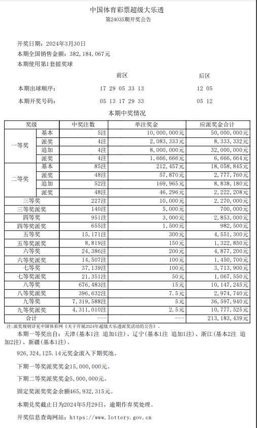 3月30日,超级大乐透迎来2024年派奖的第6期开奖——第24035期前区开出号码“05、13、17、29、33”,后区开出号码“05、12”。本期全国销量为3.82亿元,为国家筹集彩票公益金1.37亿元。