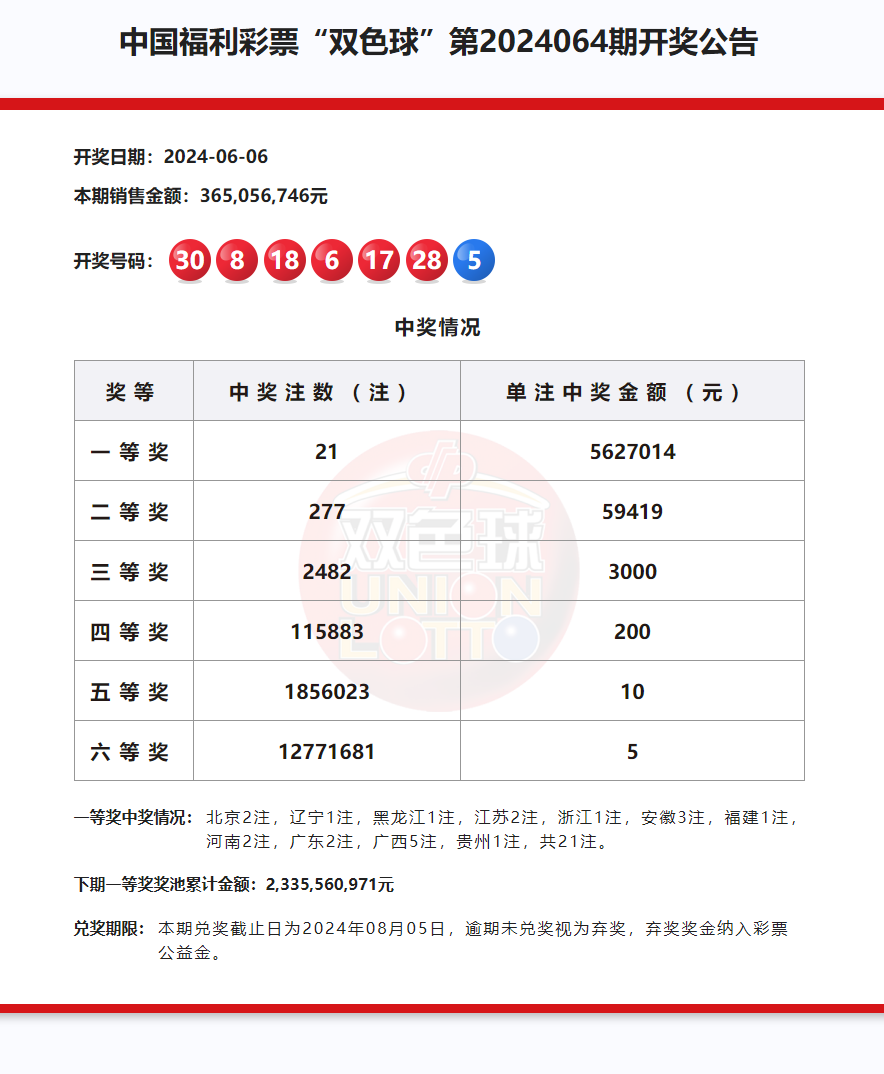 6月6日晚,福利彩票双色球游戏第2024064期开奖本期开奖号码是红球:06 08 17 18 28 30,蓝球:05。
