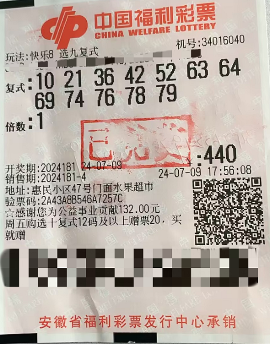 7月9日,福彩快乐8第2024181期开奖,合肥市庐江县惠民小区福彩34016040投注站,一名幸运的彩民以12码的复式彩票,中了一注九中九,二十七注选九中八,一百零八注选九中七,八十四注选九中六,喜获总奖金三十七万多元的奖金。