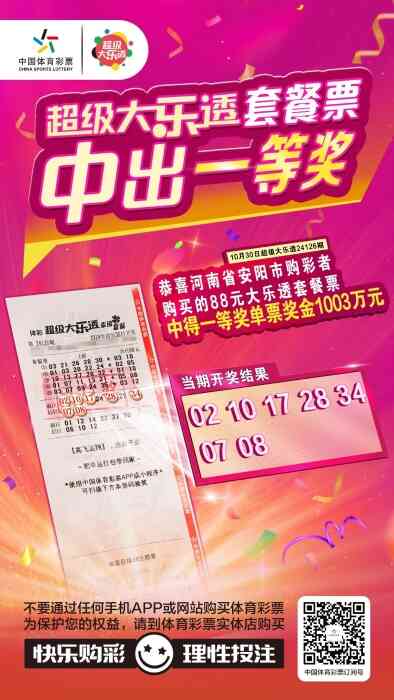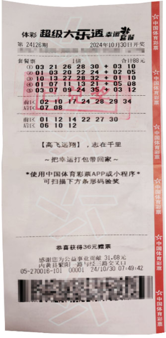 10月30日,体彩大乐透第24126期开奖,当期全国中出5注一等奖,其中1注花落河南安阳,中奖彩票为体彩大乐透88元套餐票,单票收获奖金1003万元。中出这张大乐透套餐票一等奖的体彩实体店位于河南省安阳市内黄县。