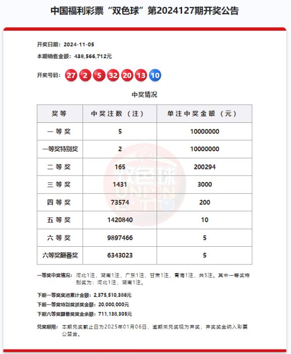 二等奖中出165注,单注奖金为20万余元。六等奖中出989万余注。六等奖翻番奖为634万余注。02奖池23.75亿元