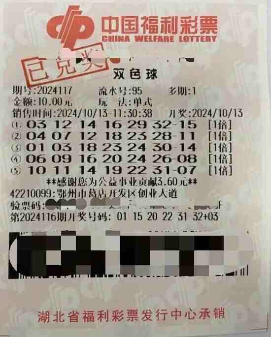 10月13日晚,福彩双色球第2024117期开奖。湖北省鄂州市中得一注二等奖,奖金20万元。