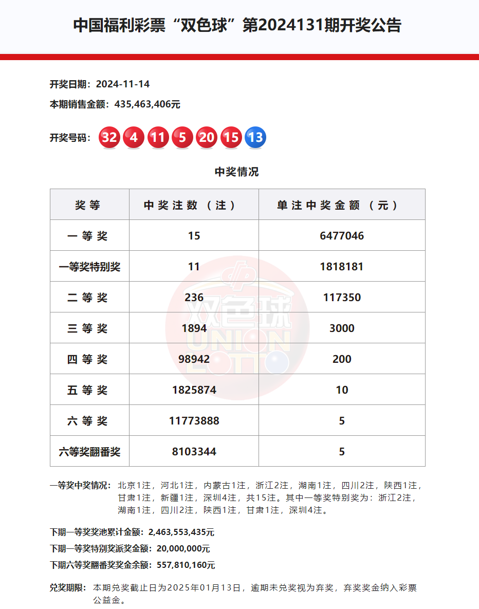 11月14日晚,中国福利彩票双色球游戏第2024131期开奖,本期双色球开奖号码为
