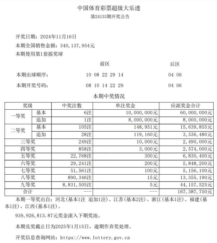 11月16日,超级大乐透第24133期开奖。前区开出号码08、10、14、22、29;后区开出号码04、06。本期全国销售3.40亿元,奖池滚存:9.39亿元。
