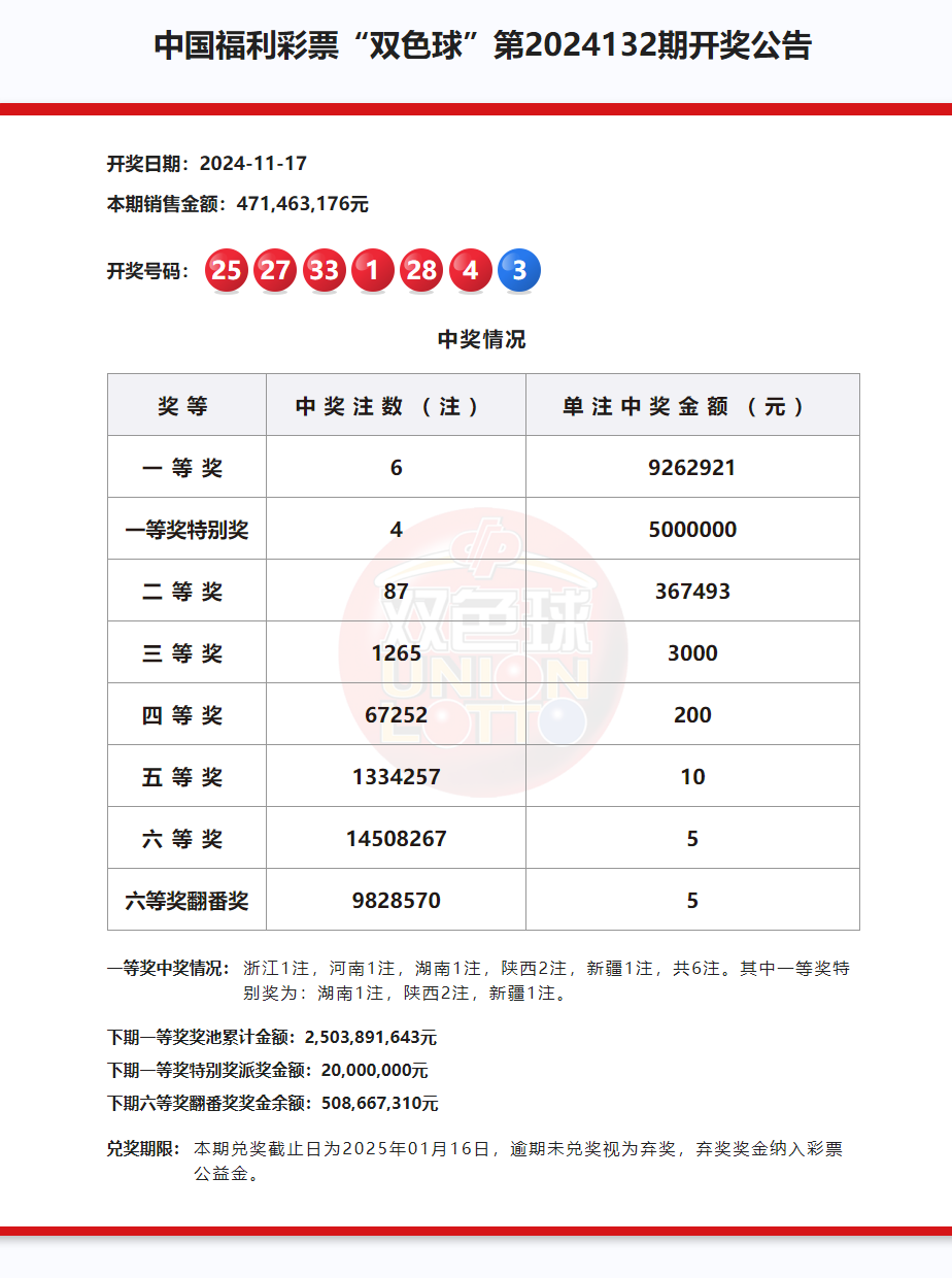 当期全国销量为4.71亿多元。计奖后,双色球奖池金额为25.03亿多元、下期一等奖特别奖派奖金额:20,000,000元、下期六等奖翻番奖奖金余额:508,667,310元。