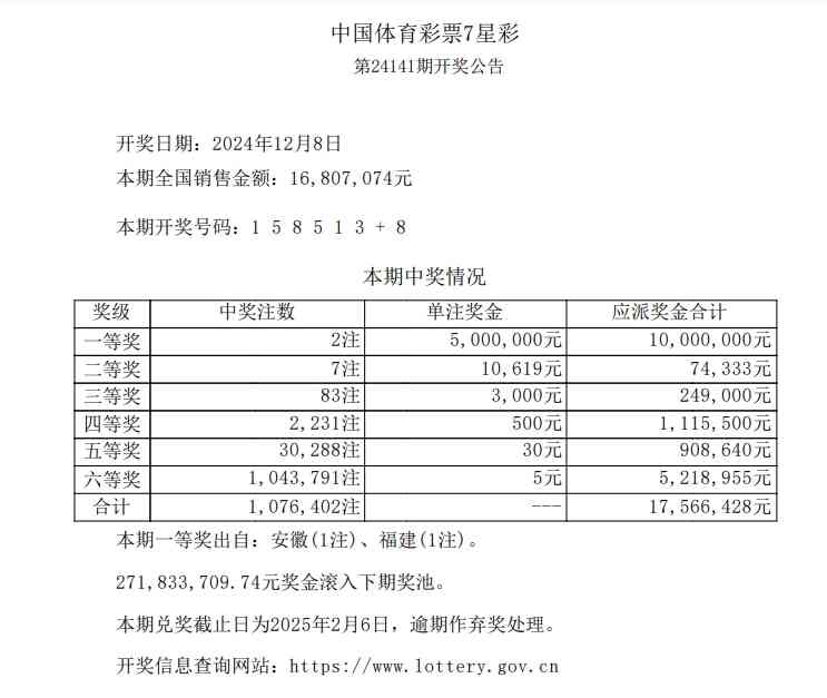 当期销量为16,807,074元。一等奖开出2注,单注奖金500万元,二等奖开出7注,单注奖金10,619元。计奖后奖池金额2.71亿元。