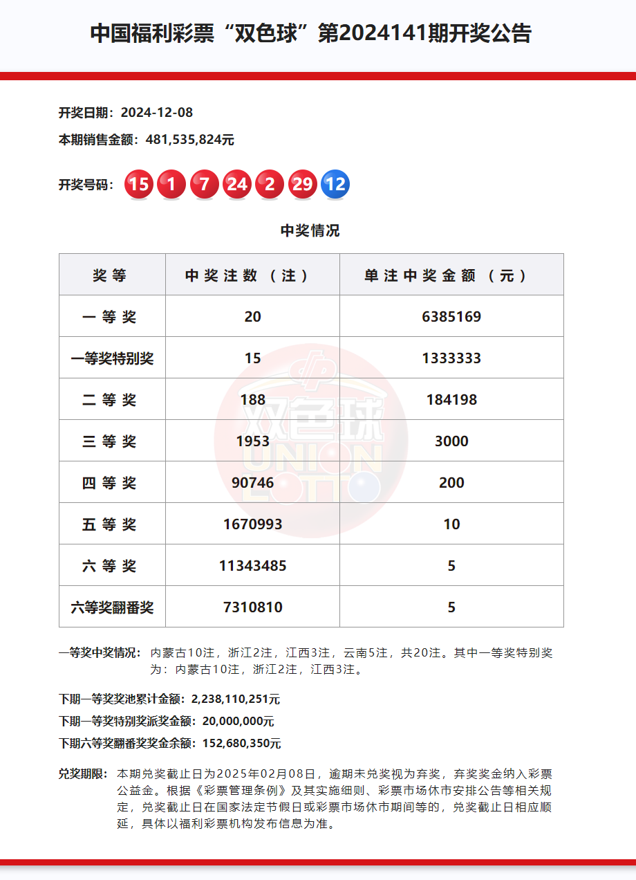 北京时间12月8日,福彩双色球第24141期开奖,同时本期还是双色球12亿大派奖的第16期开奖,当期开奖号码为红球01 02 07 15 24 29,蓝球12。
