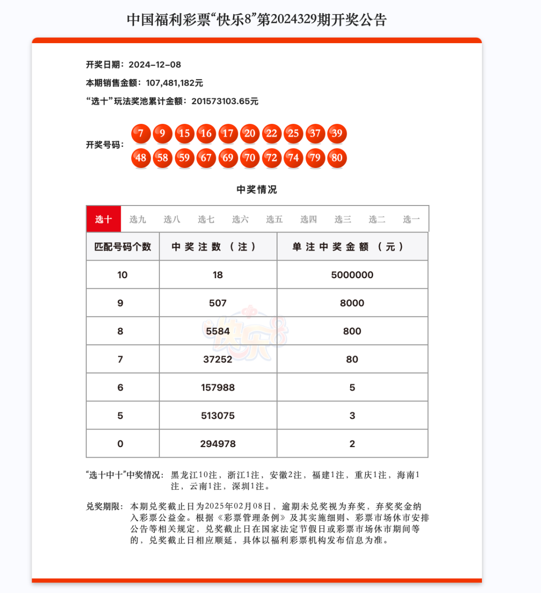 中国福彩2024329期,12月8号晚上,中国福彩“快乐8”开出一等奖18注,是“选十中十”,一等奖的奖金是5百万。