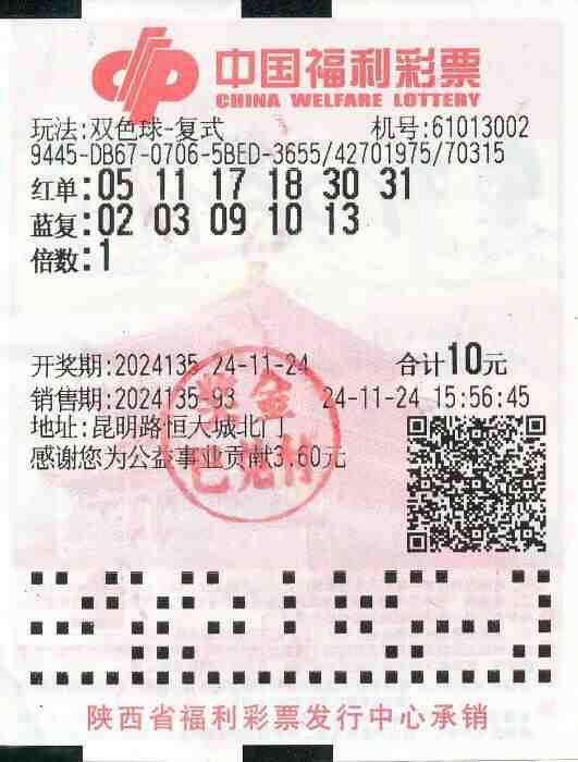 11月24号,李先生途经雁塔区昆明路,恒大北大门,61013002。下午五点五十六,,他拿老票让重打了6+5守号票,无意中给了他好运气。