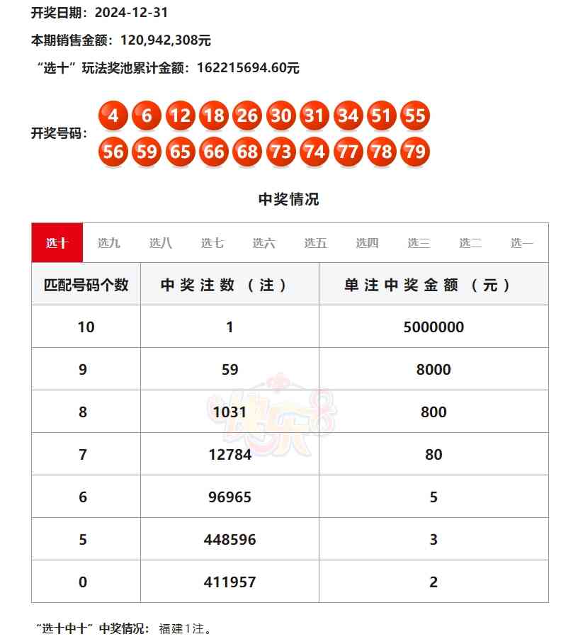 12月31日晚,中国福利彩票快乐8游戏进行第2024352期开奖。当期快乐8开奖号码为04、06、12、18、26、30、31、34、51、55、56、59、65、66、68、73、74、77、78、79。当期全国销量为1.2亿多元。计奖后,快乐8选十奖池金额1.6亿多元。