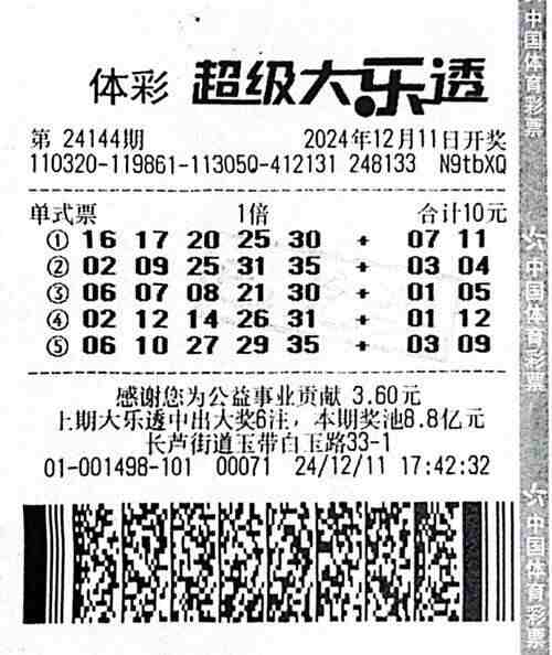 12月11日下午,他像往常一样在南京3201001498体彩网点随机打了10元5注的大乐透,当晚大乐透24144期开奖,中奖号码为“06、07、08、21、30+01、05”,结果被他的第3注号码一举命中,奖金达到1000万元。