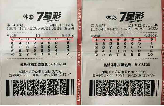 2024年12月10日,体彩7星彩第24142期开奖,开奖号码为“5、8、9、9、3、2 +9”,全国中出一等奖2注,单注奖金500万元。本期中出的2注一等奖均出自山东临沂。