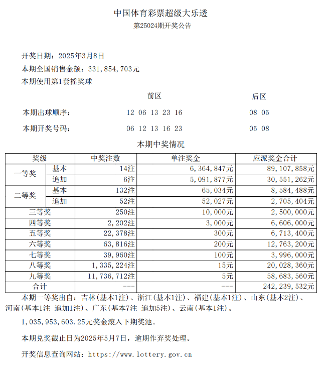 3月8日,超级大乐透迎来了第25024期的开奖盛事。在万众瞩目的开奖过程中,前区号码逐一揭晓,分别是06、12、13、16和23,而后区号码则锁定了05和08。本期大乐透在全国范围内热销,彩票销售金额高达3.31亿元,为国家的公益事业注入了1.19亿元的彩票公益金,助力教育、体育、农村振兴等多个社会公益项目,让爱的阳光洒向更多角落。