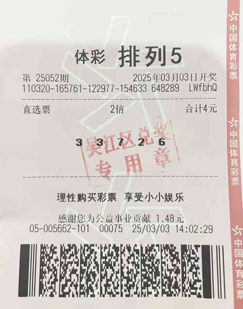 3月3日,中国体育彩票排列5第25052期开奖结果揭晓,开奖号码为3 3 7 2 6。全国范围内共开出了160注一等奖,每注奖金高达10万元。而苏州吴江的一位幸运购彩者,更是凭借自己的好运,揽获了其中的2注,奖金总额达到了20万元。这份大奖出自吴江区盛泽镇茅塔路纺机市场红绿灯口的3205005662体彩网点。