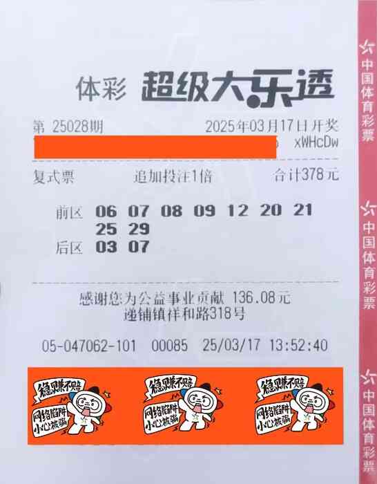 3月17日,体彩超级大乐透第25028期开奖盛况揭晓,前区号码为06、08、20、25、29,后区号码则为03、07。我省一位购彩者凭借一张“9+2”复式追加票,幸运地击中了1注超级大乐透追加一等奖,单票斩获奖金高达1610万元!这注令人瞩目的大奖诞生于湖州市安吉县递铺镇祥和路318号的3305047062体彩实体店。