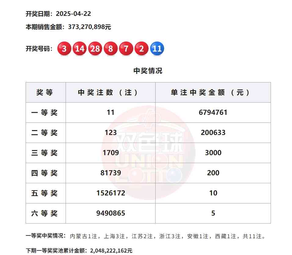 当期双色球一等奖中出11注,单注奖金679万元。大奖分落内蒙古1注、上海3注、江苏2注、浙江3注、安徽1注、西藏1注。