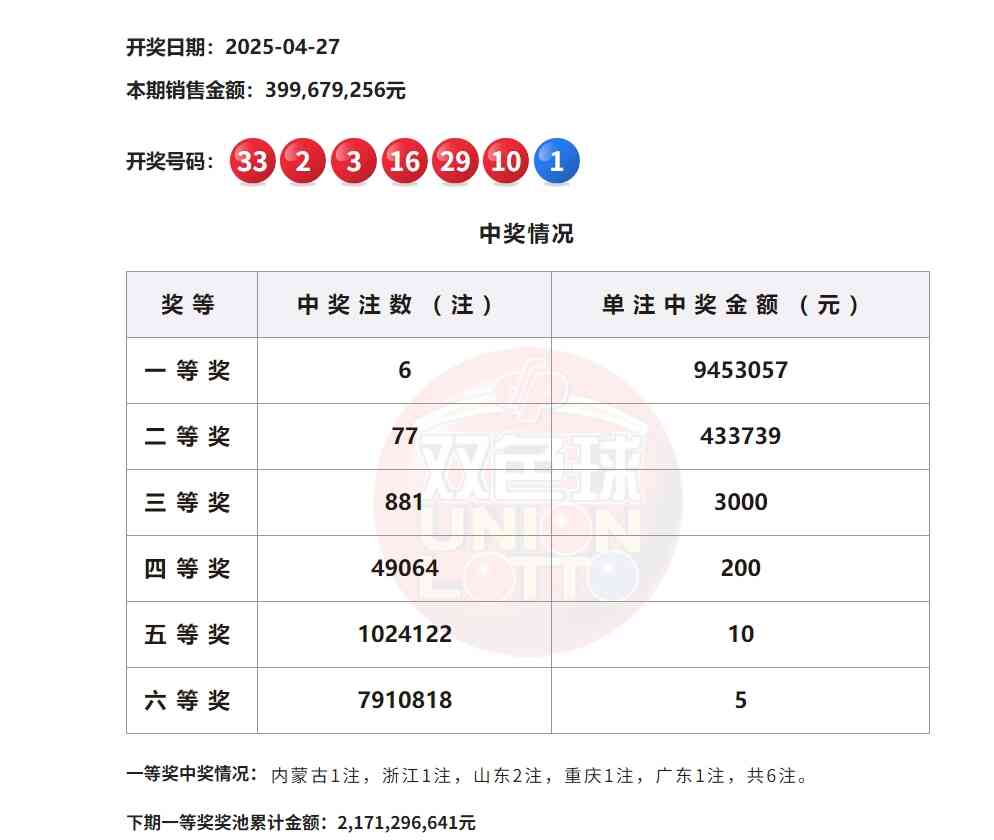 当期全国销量为3.99亿多元。计奖后,双色球奖池金额为21.71亿多元。