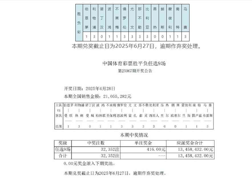 北京时间4月28日,胜负彩第25067期任九开奖结果揭晓。本期足彩任九井喷32352注,单注奖金416元。本期任九投注总额为21,055,282元。