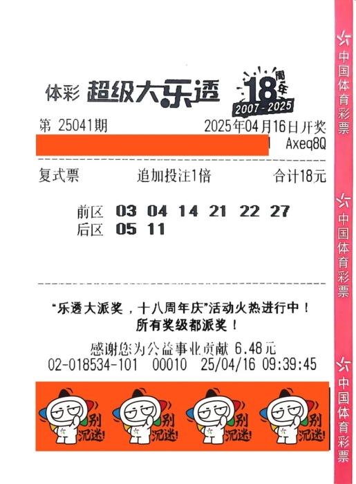 时光回溯到4月16日,超级大乐透第25041期开奖结果揭晓,前区号码为03、04、21、22、27,后区号码为05、11。浙江省宁波的一位购彩者凭借一张“6 + 2”复式追加票,成功斩获1注大乐透追加一等奖,单票揽获奖金高达1672万元,而这位幸运儿正是刘大爷。
