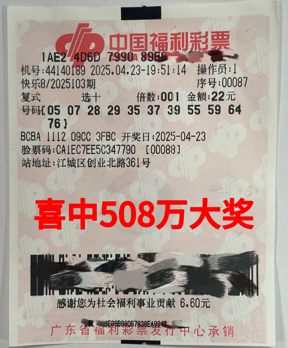 4月23日,中国福利彩票快乐8第2025103期开奖结果揭晓。当期,全国仅中出1注“选十中十”一等奖,这注幸运大奖花落阳江市江城区创业北路361号的44140189福彩销售站点。中奖彩票是一张面值22元的“选十玩法”11个号码自选复式票,这张彩票不仅中得1注“选十中十”,还揽获10注“选十中九”,总奖金高达508万元,这也是今年阳江市首个500万元以上的大奖。
